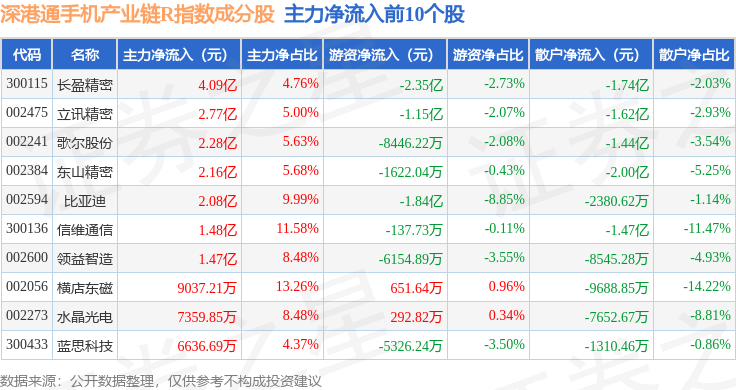 资金流向方面,深港通手机产业链R(483009)指数成份股当日主力资金净流入合计5.32亿元,游资资金净流出合计7.45亿元,散户资金净流入合计2.13亿元。成份股资金流向详情见下表: