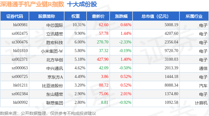 深港通手机产业链R(483009)指数十大成份股详情如下:
