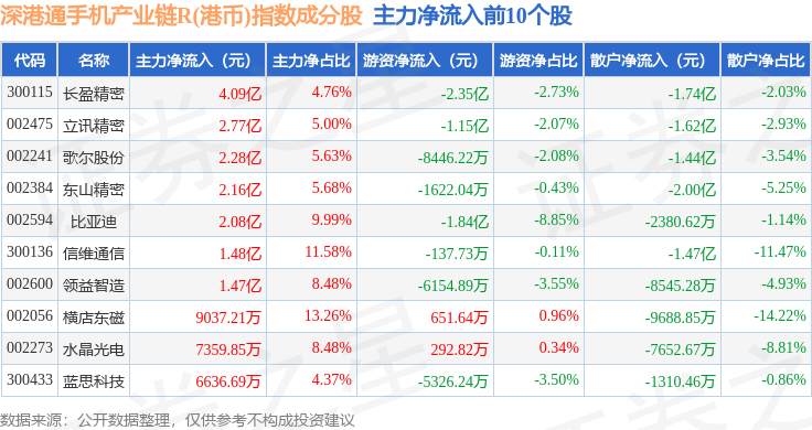 资金流向方面,深港通手机产业链R(港币)(483010)指数成份股当日主力资金净流入合计5.32亿元,游资资金净流出合计7.45亿元,散户资金净流入合计2.13亿元。成份股资金流向详情见下表: