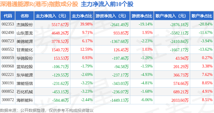 资金流向方面,深港通能源R(港币)(483014)指数成份股当日主力资金净流入合计1.13亿元,游资资金净流出合计3820.39万元,散户资金净流出合计7490.08万元。成份股资金流向详情见下表: