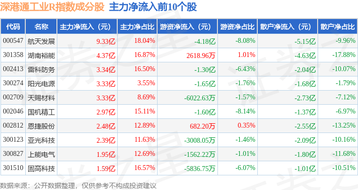 资金流向方面,深港通工业R(483017)指数成份股当日主力资金净流入合计32.78亿元,游资资金净流出合计13.5亿元,散户资金净流出合计19.28亿元。成份股资金流向详情见下表: