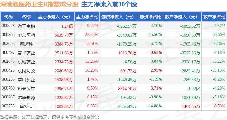资金流向方面,深港通医药卫生R(483023)指数成份股当日主力资金净流出合计13.96亿元,游资资金净流入合计1.29亿元,散户资金净流入合计12.67亿元。成份股资金流向详情见下表: