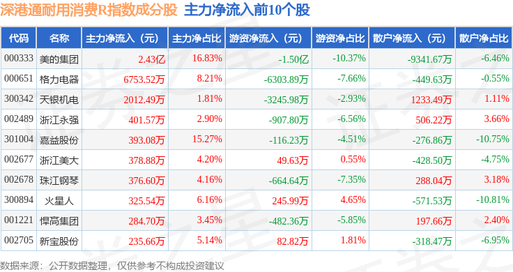 资金流向方面,深港通耐用消费R(483049)指数成份股当日主力资金净流出合计3229.56万元,游资资金净流出合计2.61亿元,散户资金净流入合计2.93亿元。成份股资金流向详情见下表: