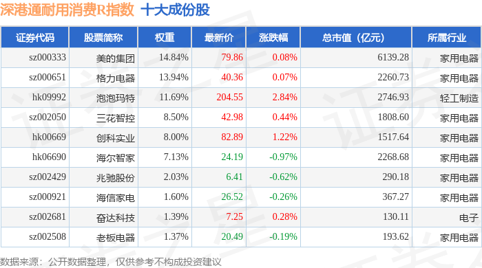 深港通耐用消费R(483049)指数十大成份股详情如下: