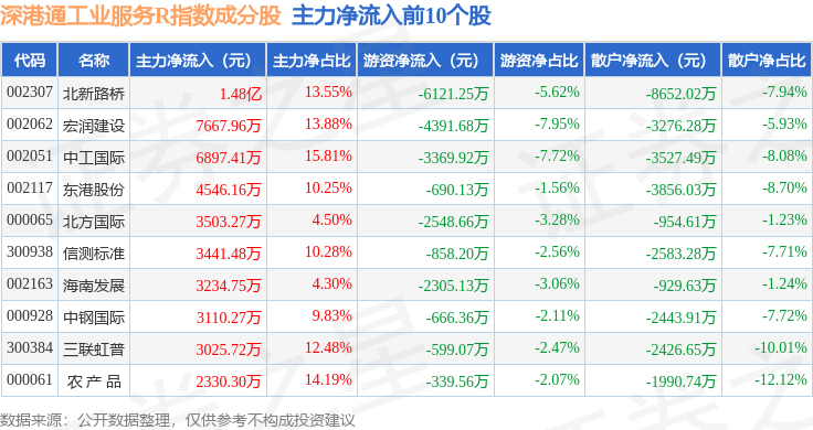 资金流向方面,深港通工业服务R(483055)指数成份股当日主力资金净流入合计1.15亿元,游资资金净流出合计2.73亿元,散户资金净流入合计1.57亿元。成份股资金流向详情见下表: