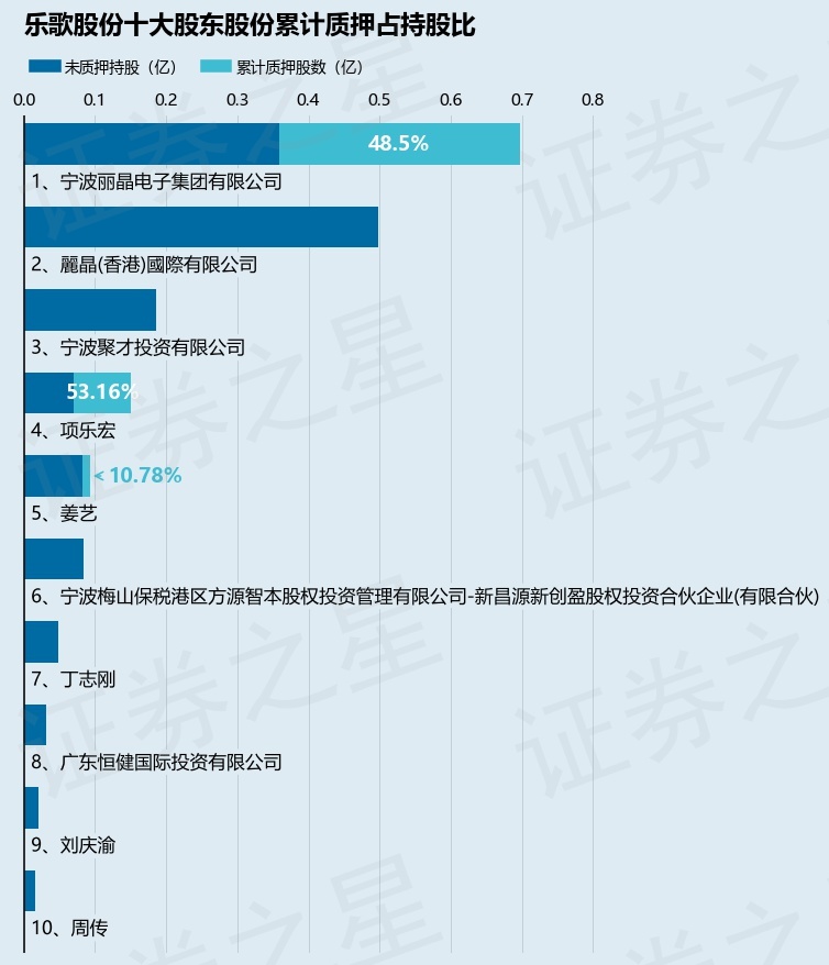 截止本公告日,股东宁波丽晶电子集团有限公司已累计质押股份3380.6万股,占其持股总数的48.5%,股东项乐宏已累计质押股份800.0万股,占其持股总数的53.16%,股东姜艺已累计质押股份100.0万股,占其持股总数的10.78%。本次质押后乐歌股份十大股东的累计质押股份占持股比例(占持股比例的计算以公司最新一期财务报表公布的十大股东的持股总数为基准)见下图: