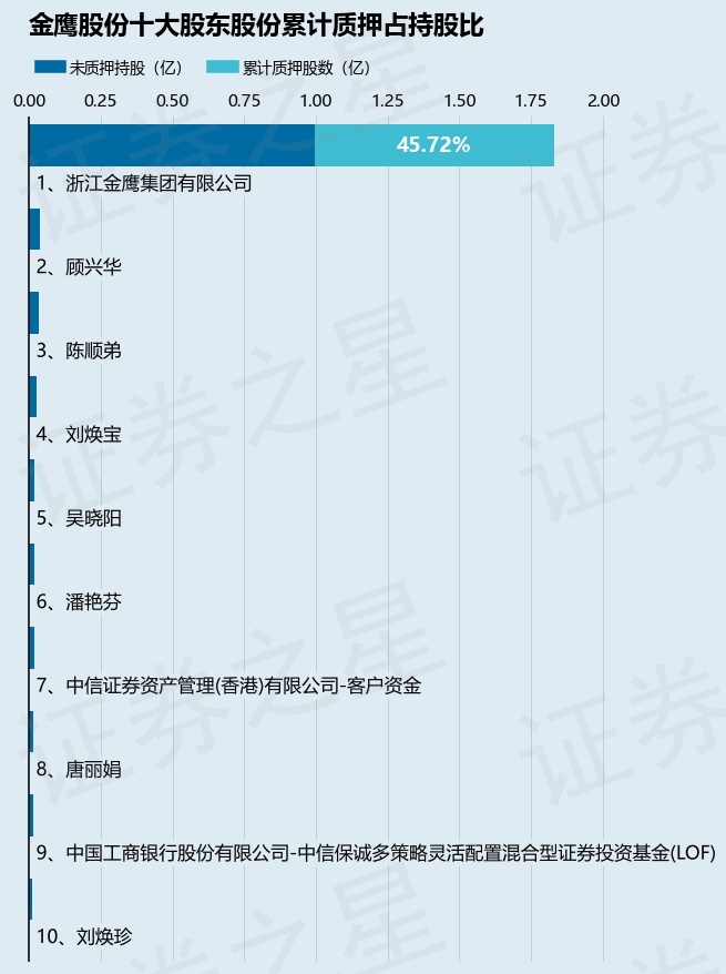 截止本公告日,股东浙江金鹰集团有限公司已累计质押股份8379.46万股,占其持股总数的45.72%。本次质押后金鹰股份十大股东的累计质押股份占持股比例(占持股比例的计算以公司最新一期财务报表公布的十大股东的持股总数为基准)见下图: