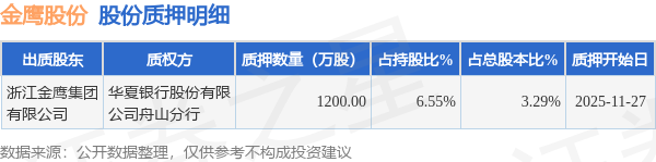 证券之星消息,金鹰股份(600232)11月28日公开信息显示,股东浙江金鹰集团有限公司向华夏银行股份有限公司舟山分行合计质押1200.0万股,占总股本3.29%。质押详情见下表: