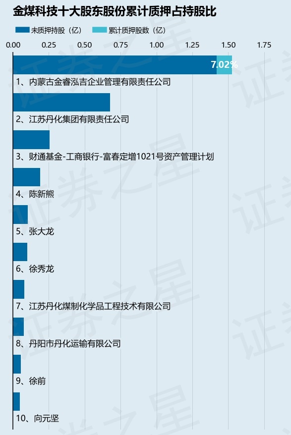 截止本公告日,股东内蒙古金睿泓吉企业管理有限责任公司已累计质押股份1070.0万股,占其持股总数的7.02%。本次质押后金煤科技十大股东的累计质押股份占持股比例(占持股比例的计算以公司最新一期财务报表公布的十大股东的持股总数为基准)见下图: