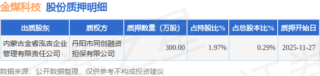 证券之星消息,金煤科技(600844)11月28日公开信息显示,股东内蒙古金睿泓吉企业管理有限责任公司向丹阳市同创融资担保有限公司合计质押300.0万股,占总股本0.29%。质押详情见下表: