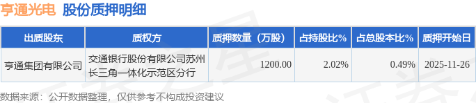 证券之星消息,亨通光电(600487)11月28日公开信息显示,股东亨通集团有限公司向交通银行股份有限公司苏州长三角一体化示范区分行合计质押1200.0万股,占总股本0.49%。质押详情见下表: