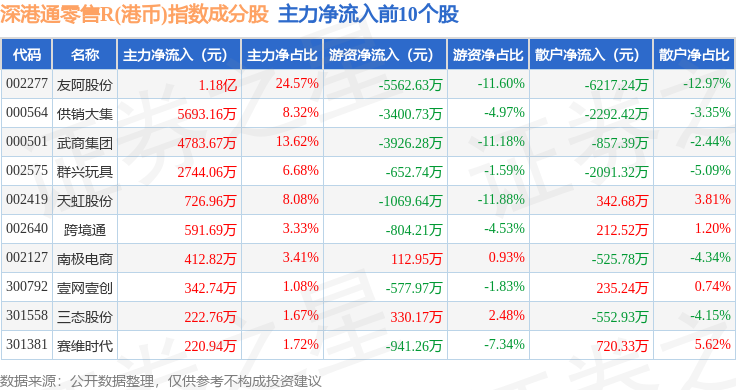 资金流向方面,深港通零售R(港币)(483074)指数成份股当日主力资金净流入合计1.49亿元,游资资金净流出合计4869.67万元,散户资金净流出合计1.0亿元。成份股资金流向详情见下表: