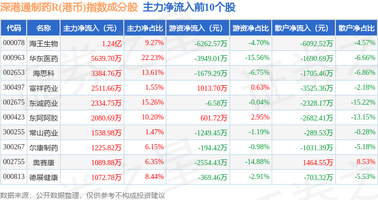 资金流向方面,深港通制药R(港币)(483080)指数成份股当日主力资金净流出合计9.89亿元,游资资金净流出合计4193.56万元,散户资金净流入合计10.31亿元。成份股资金流向详情见下表: