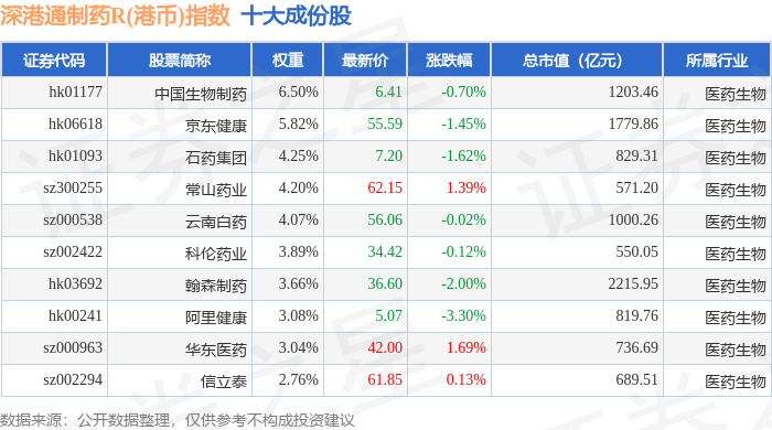 深港通制药R(港币)(483080)指数十大成份股详情如下: