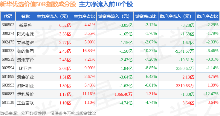 资金流向方面,新华优选价值50R(489004)指数成份股当日主力资金净流出合计9685.5万元,游资资金净流出合计6.06亿元,散户资金净流入合计7.03亿元。成份股资金流向详情见下表: