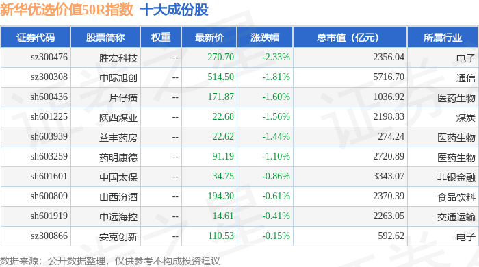 新华优选价值50R(489004)指数十大成份股详情如下: