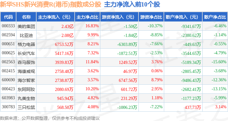 资金流向方面,新华SHS新兴消费R(港币)(489007)指数成份股当日主力资金净流入合计3.25亿元,游资资金净流出合计2.17亿元,散户资金净流出合计1.08亿元。成份股资金流向详情见下表: