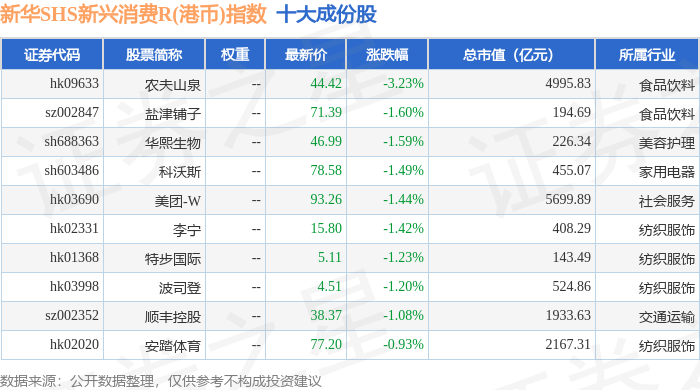 新华SHS新兴消费R(港币)(489007)指数十大成份股详情如下: