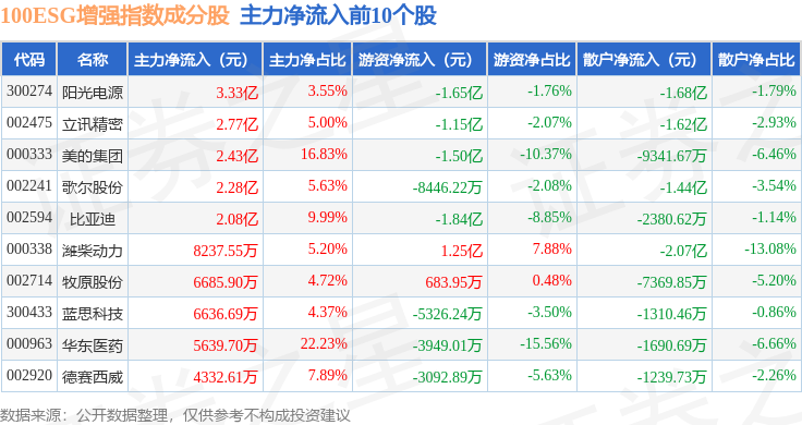 资金流向方面,100ESG增强(970033)指数成份股当日主力资金净流出合计10.3亿元,游资资金净流入合计5.4亿元,散户资金净流入合计4.9亿元。成份股资金流向详情见下表: