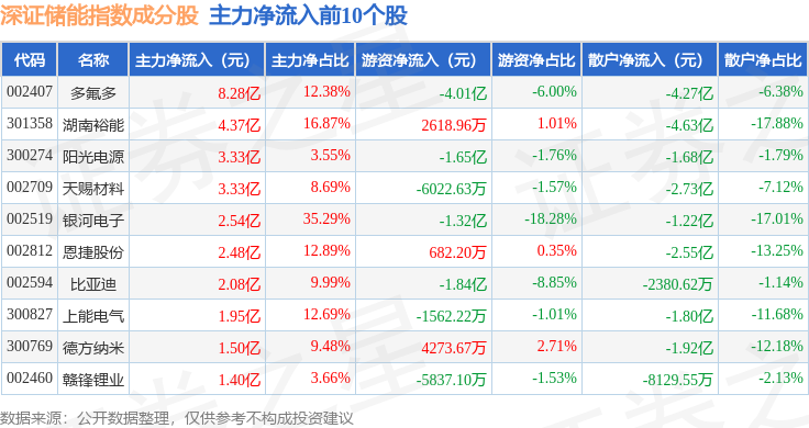 资金流向方面,深证储能(970036)指数成份股当日主力资金净流入合计30.95亿元,游资资金净流出合计6.94亿元,散户资金净流出合计24.01亿元。成份股资金流向详情见下表: