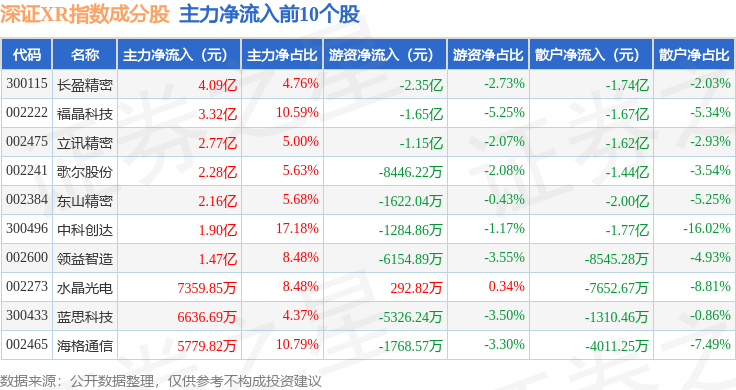 资金流向方面,深证XR(970046)指数成份股当日主力资金净流入合计7.32亿元,游资资金净流出合计6.26亿元,散户资金净流出合计1.06亿元。成份股资金流向详情见下表:
