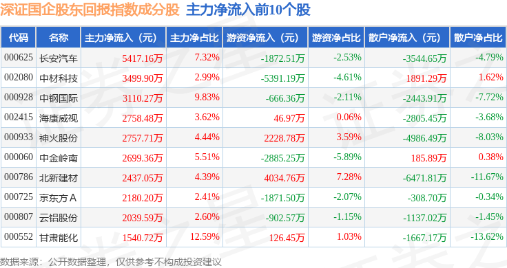 资金流向方面,深证国企股东回报(970064)指数成份股当日主力资金净流入合计5659.73万元,游资资金净流出合计6981.64万元,散户资金净流入合计1321.91万元。成份股资金流向详情见下表: