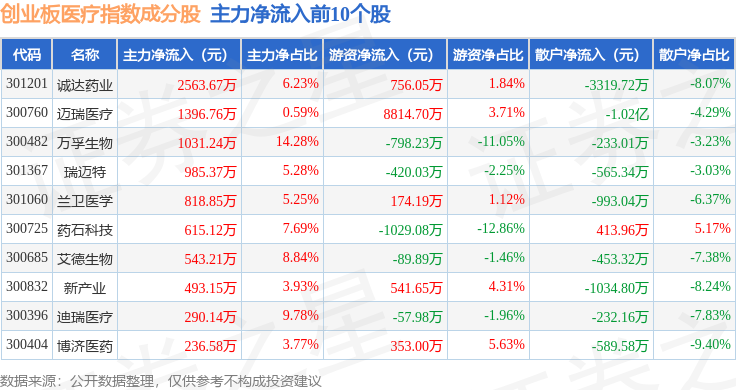 资金流向方面,创业板医疗(970082)指数成份股当日主力资金净流出合计1.64亿元,游资资金净流入合计7174.73万元,散户资金净流入合计9256.81万元。成份股资金流向详情见下表: