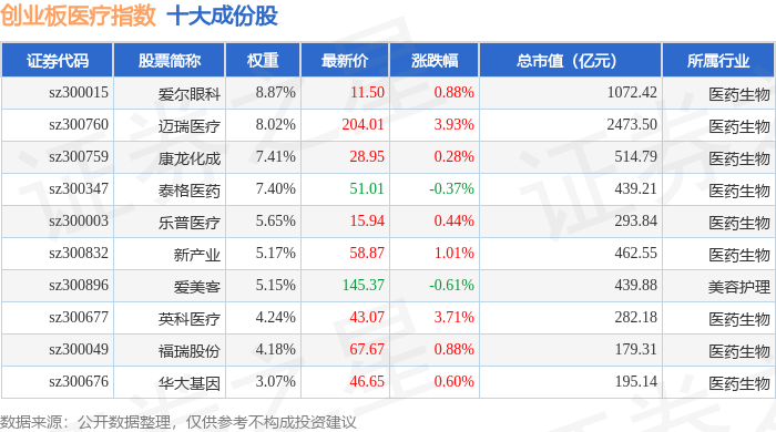 证券之星消息,11月28日,创业板医疗(970082)指数报收于3693.82点,涨0.87%,成交84.09亿元,换手率0.95%。当日该指数成份股中,上涨的有37家,诚达药业以4.79%的涨幅领涨,下跌的有11家,中红医疗以2.07%的跌幅领跌。