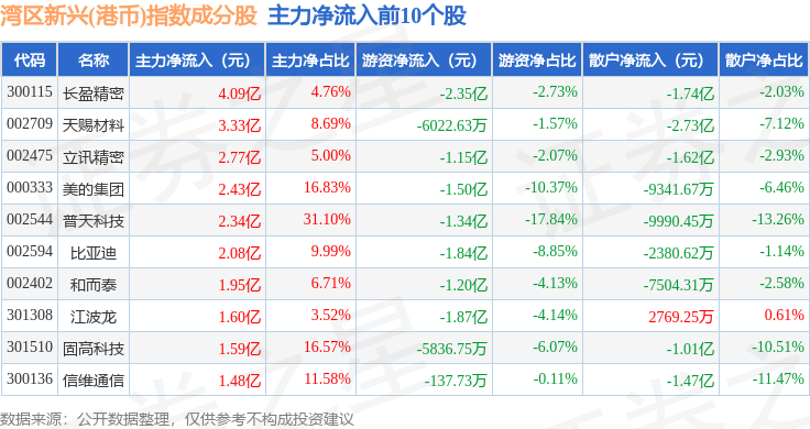 资金流向方面,湾区新兴(港币)(980008)指数成份股当日主力资金净流入合计1.96亿元,游资资金净流出合计12.66亿元,散户资金净流入合计10.71亿元。成份股资金流向详情见下表: