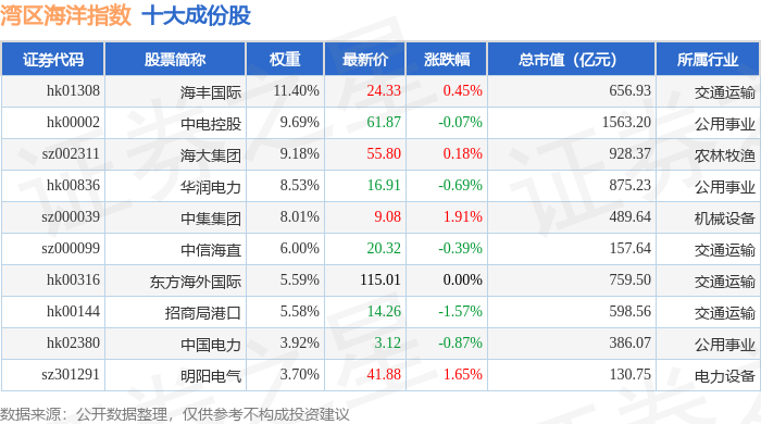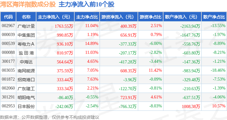 资金流向方面,湾区海洋(980019)指数成份股当日主力资金净流出合计1640.15万元,游资资金净流入合计355.06万元,散户资金净流入合计1285.09万元。成份股资金流向详情见下表:
