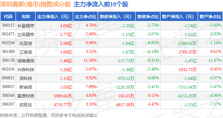 资金流向方面,深圳高新(港币)(980039)指数成份股当日主力资金净流入合计5.71亿元,游资资金净流出合计9.85亿元,散户资金净流入合计4.14亿元。成份股资金流向详情见下表:
