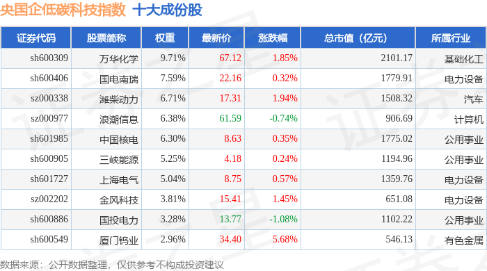 央国企低碳科技(980082)指数十大成份股详情如下: