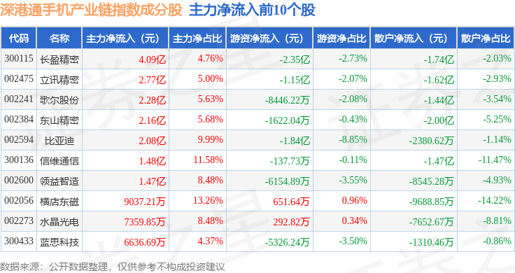 资金流向方面,深港通手机产业链(983009)指数成份股当日主力资金净流入合计5.32亿元,游资资金净流出合计7.45亿元,散户资金净流入合计2.13亿元。成份股资金流向详情见下表: