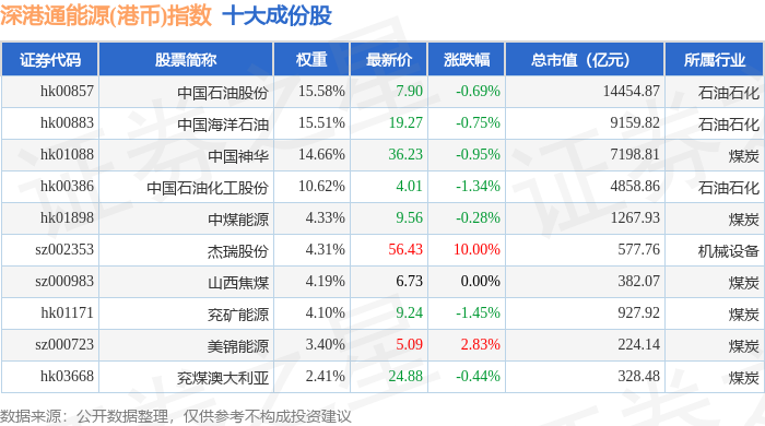 深港通能源(港币)(983014)指数十大成份股详情如下: