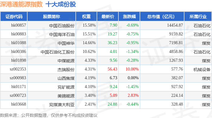 证券之星消息,11月28日,深港通能源(983013)指数报收于6842.4点,涨0.04%,成交40.76亿元,换手率0.35%。当日该指数成份股中,上涨的有19家,杰瑞股份以10.0%的涨幅领涨,下跌的有10家,兖矿能源以1.45%的跌幅领跌。