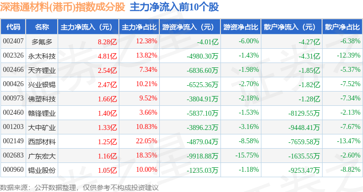 资金流向方面,深港通材料(港币)(983016)指数成份股当日主力资金净流入合计33.43亿元,游资资金净流出合计14.25亿元,散户资金净流出合计19.19亿元。成份股资金流向详情见下表: