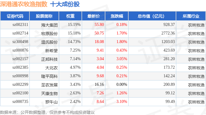 深港通农牧渔(983051)指数十大成份股详情如下: