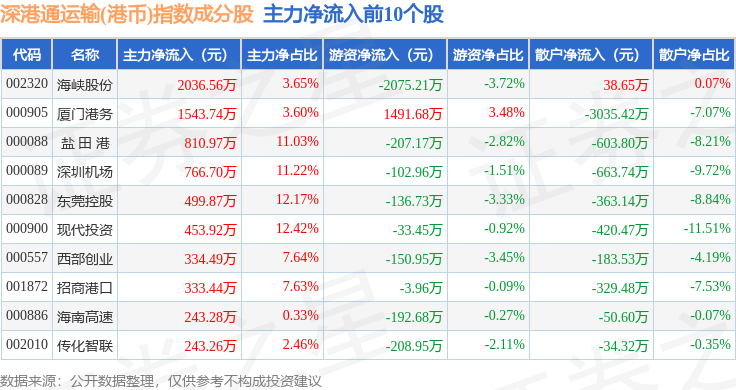 资金流向方面,深港通运输(港币)(983078)指数成份股当日主力资金净流出合计1.99亿元,游资资金净流入合计2106.44万元,散户资金净流入合计1.78亿元。成份股资金流向详情见下表: