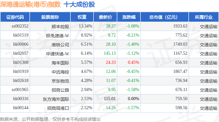 深港通运输(港币)(983078)指数十大成份股详情如下: