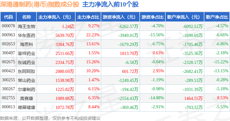 资金流向方面,深港通制药(港币)(983080)指数成份股当日主力资金净流出合计9.89亿元,游资资金净流出合计4193.56万元,散户资金净流入合计10.31亿元。成份股资金流向详情见下表: