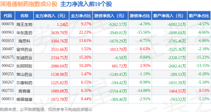 资金流向方面,深港通制药(983079)指数成份股当日主力资金净流出合计9.89亿元,游资资金净流出合计4193.56万元,散户资金净流入合计10.31亿元。成份股资金流向详情见下表: