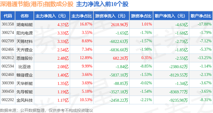 资金流向方面,深港通节能(港币)(983086)指数成份股当日主力资金净流入合计19.08亿元,游资资金净流出合计1.64亿元,散户资金净流出合计17.44亿元。成份股资金流向详情见下表: