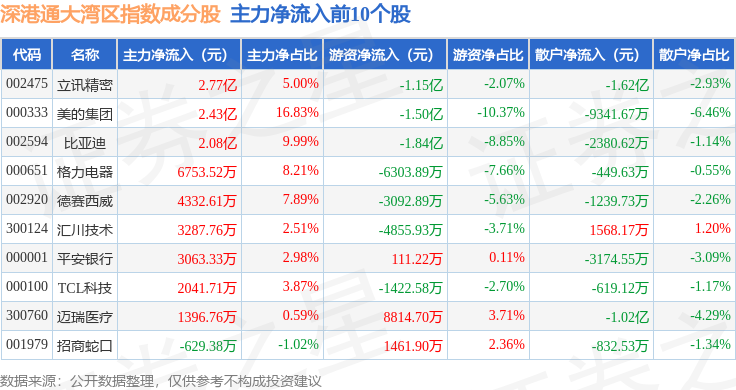 资金流向方面,深港通大湾区(983089)指数成份股当日主力资金净流出合计8.55亿元,游资资金净流出合计7760.56万元,散户资金净流入合计9.32亿元。成份股资金流向详情见下表: