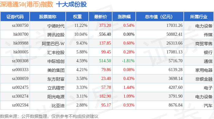 深港通50(港币)(983092)指数十大成份股详情如下: