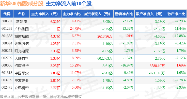 资金流向方面,新华500(989001)指数成份股当日主力资金净流出合计4.56亿元,游资资金净流出合计5.67亿元,散户资金净流入合计10.23亿元。成份股资金流向详情见下表: