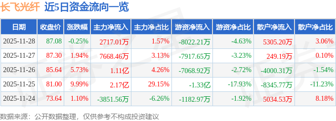 证券之星消息,截至2025年11月28日收盘,长飞光纤(601869)报收于87.08元,下跌0.25%,换手率4.91%,成交量19.97万手,成交额17.33亿元。