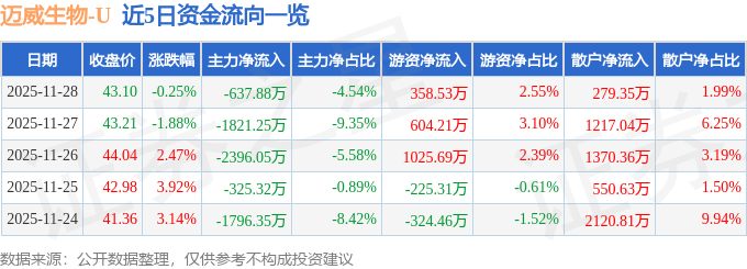证券之星消息,截至2025年11月28日收盘,迈威生物(688062)报收于43.1元,下跌0.25%,换手率1.6%,成交量3.27万手,成交额1.41亿元。
