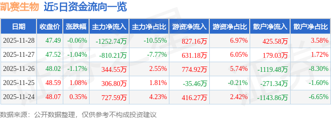 证券之星消息,截至2025年11月28日收盘,凯赛生物(688065)报收于47.49元,下跌0.06%,换手率0.43%,成交量2.5万手,成交额1.19亿元。