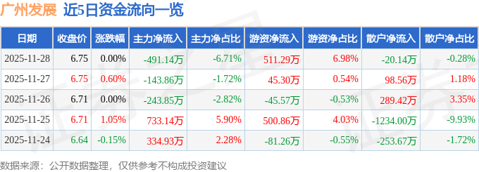 证券之星消息,截至2025年11月28日收盘,广州发展(600098)报收于6.75元,上涨0.0%,换手率0.31%,成交量10.84万手,成交额7324.37万元。