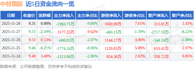证券之星消息,截至2025年11月28日收盘,中材国际(600970)报收于9.31元,上涨0.0%,换手率1.05%,成交量23.55万手,成交额2.19亿元。